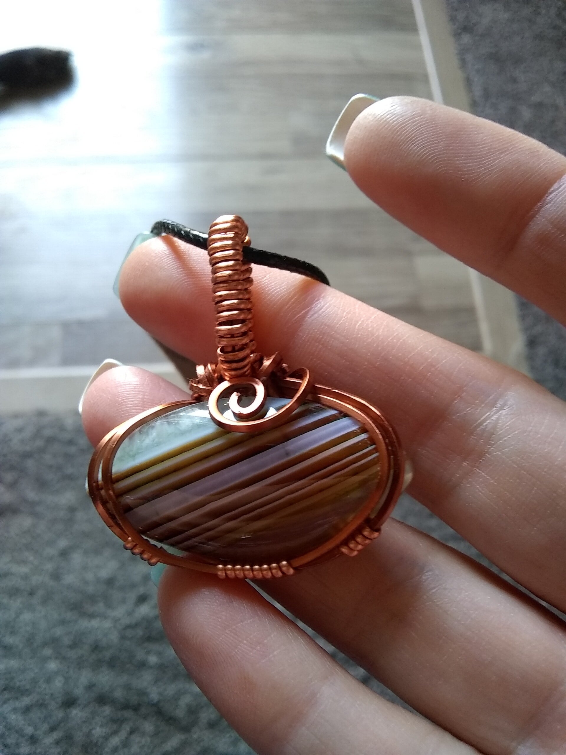 Banded Agate wrapped in two-tone copper-colored wire. 1 1/4 inches tall by 1 1/2 inches wide.