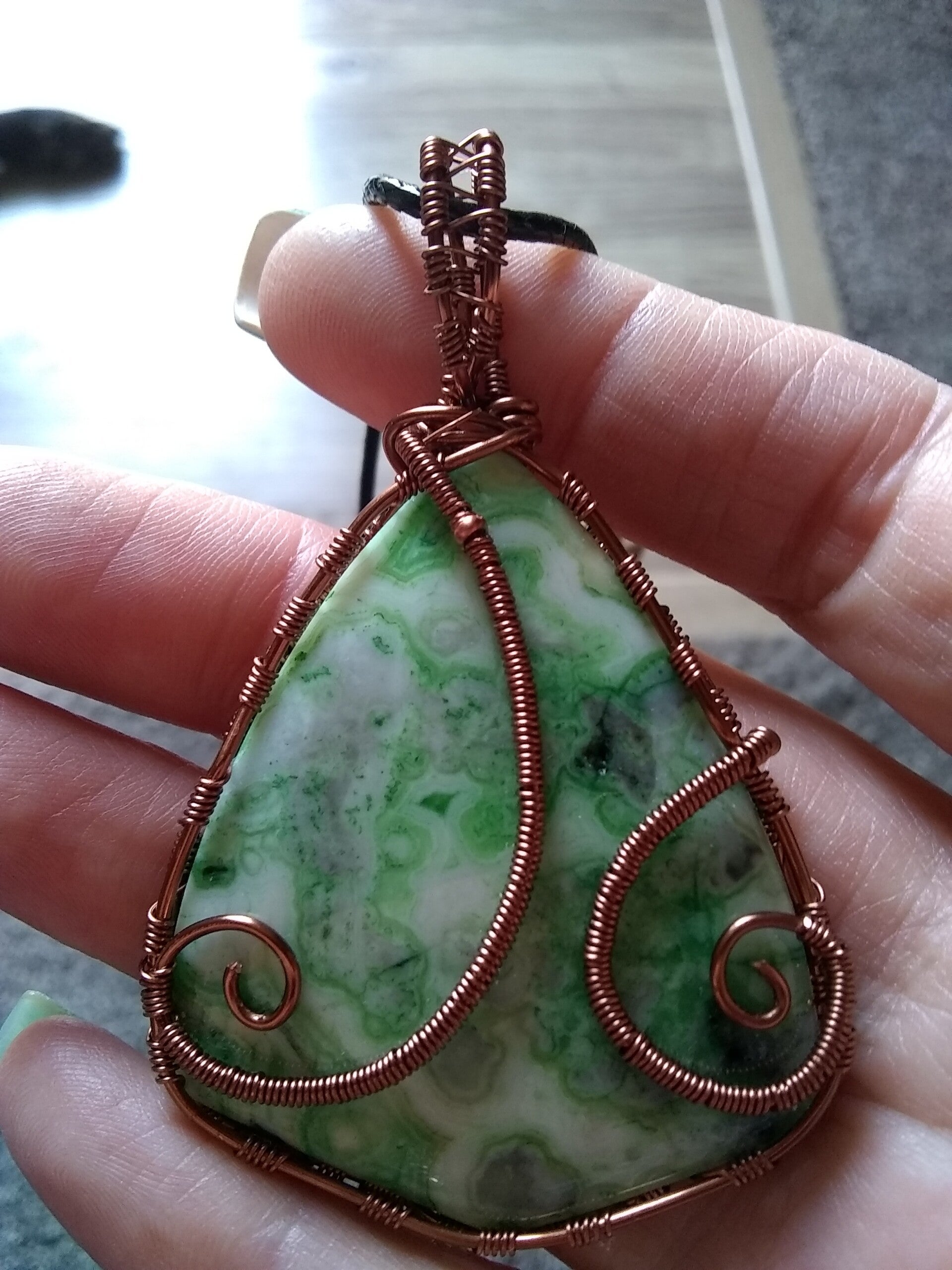 Green Lace Agate wrapped in Antique copper-colored coated copper wire. This piece is 2 3/4 inches tall by 1 1/2 inches wide.